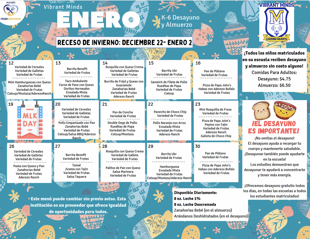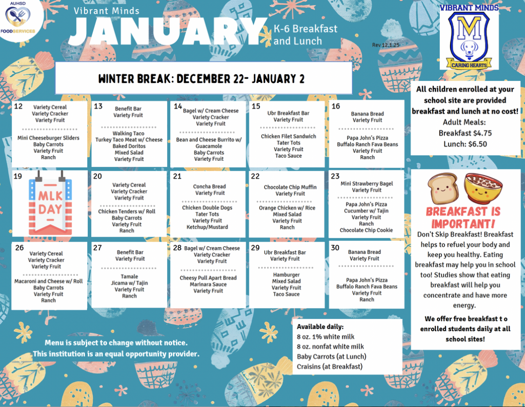 A monthly meal menu will be sent home, or you can download it here. We ask families to indicate which meals their scholars will participate in approximately one week prior to the start of a new month.